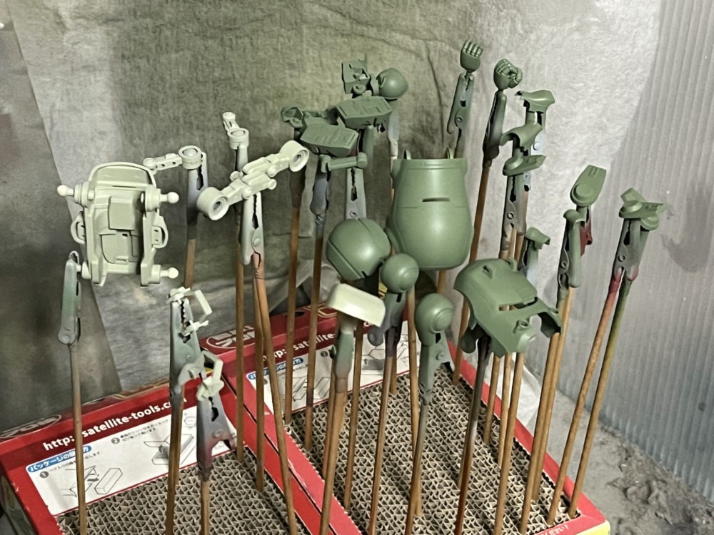 サフ後に外装のメインカラーである濃いグリーンを吹いていきます。