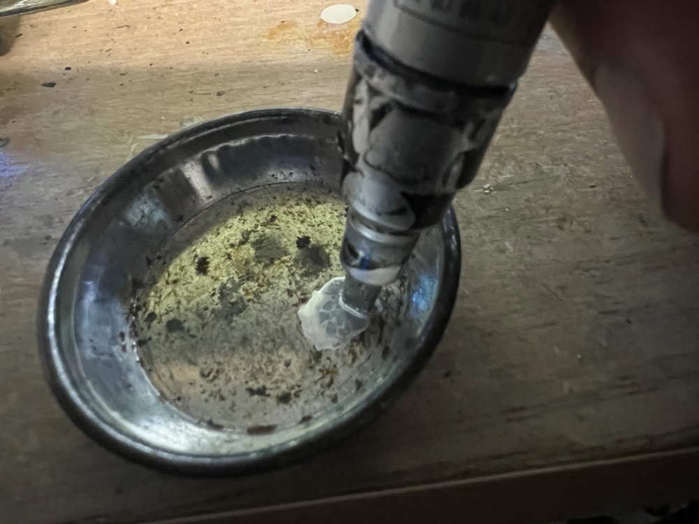 シルバーでの塗り分けはお得意の?『タミヤ ペイントマーカー X-11 クロムシルバー 塗料』を万年皿に出して使用です。